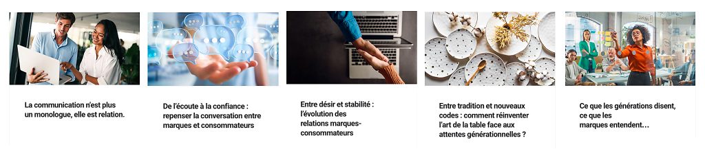 Antonella Szitas , experte du marketing digital et des nouvelles technologies : La communication n’est plus un monologue, elle est relation Fabrice Frossard, fondateur de Faber Content décrypte les tendances clés de notre étude sur les Tendances Social Media 2026 – Patrice Laubignat, Fondateur Eforbrands, conférencier, consultant, CMO et auteur nous partage sa vision des liens entre émotions, fidélité et désir dans la relation marques-consommateurs – Thierry Villotte, Président de la Confédération des Arts de la Table, et Céline Beckrich, Secrétaire Générale, partagent leur vision des tendances générationnelles et expliquent comment la filière s’adapte aux nouveaux comportements, entre valorisation du patrimoine et adoption des codes digitaux – Pauline Dujardin, Directrice de la marque du Groupe Matmut, nous partage sa vision sur la manière d’adresser efficacement chaque génération.